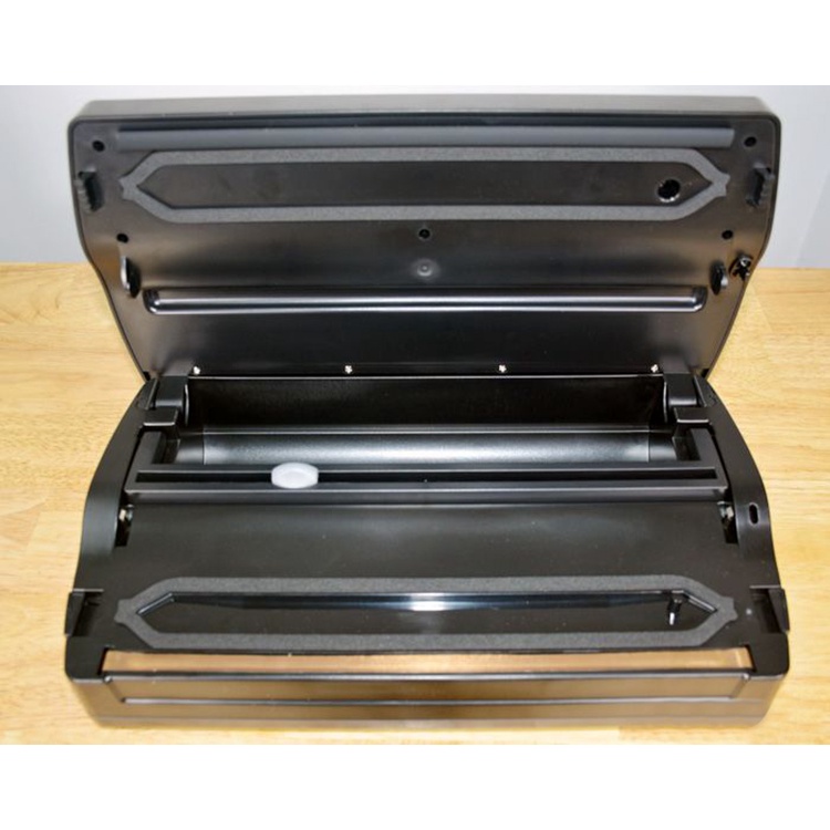 Bước 2: Mở máy bằng cách ấn 2 bên của nắp máy xuống. Đặt miệng túi vào khoang hàn.