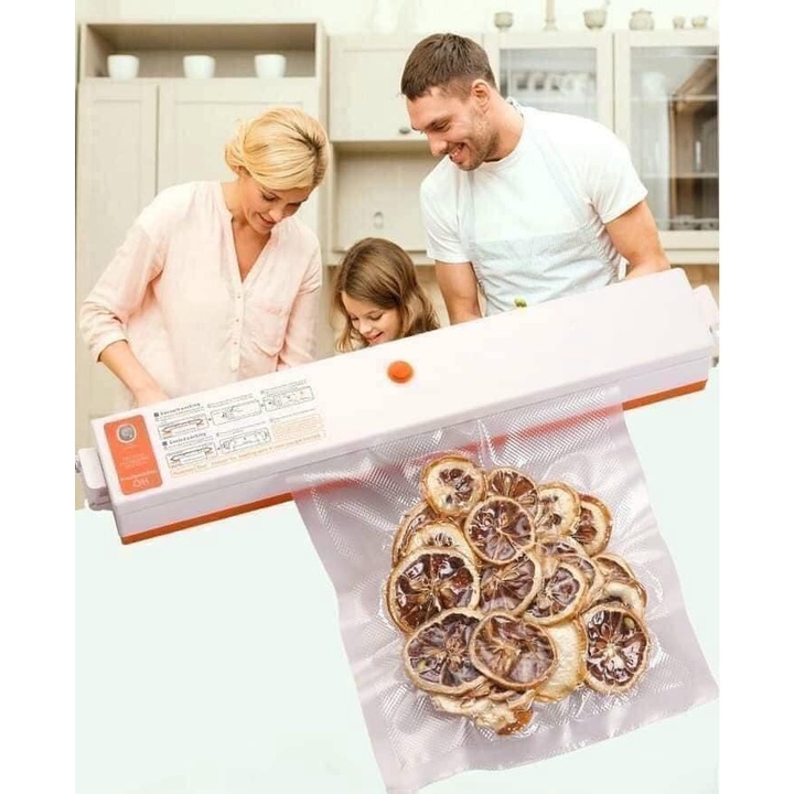 ☑️ Chỉ cần cho thực phẩm vào túi, kẹp miệng túi vào máy, và nhấn nút. Máy sẽ hút kiệt không khí bên trong, sau đó tự động hàn kín miệng túi. Thực phẩm được bảo quản trong môi trường yếm khí, ko bị oxy hóa, ko bị vi khuẩn tấn công, ngăn mùi, ngăn ẩm mốc, tươi ngon lâu hơn.