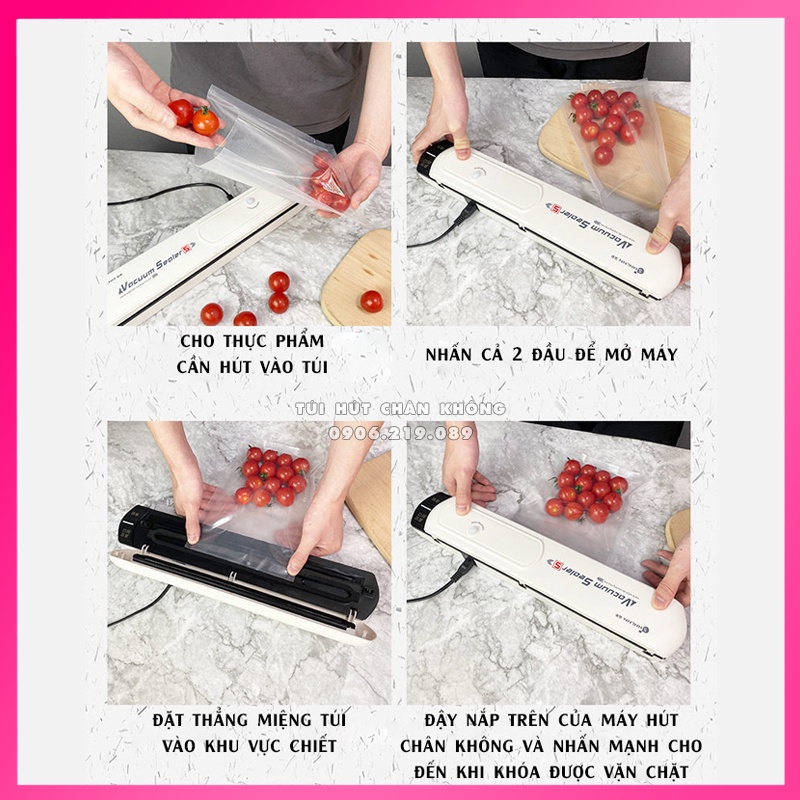 - B.2: Cho thực phẩm vào trong các túi chuyên dụng 1 mặt nhám 1 mặt trơn như túi kèm theo máy.