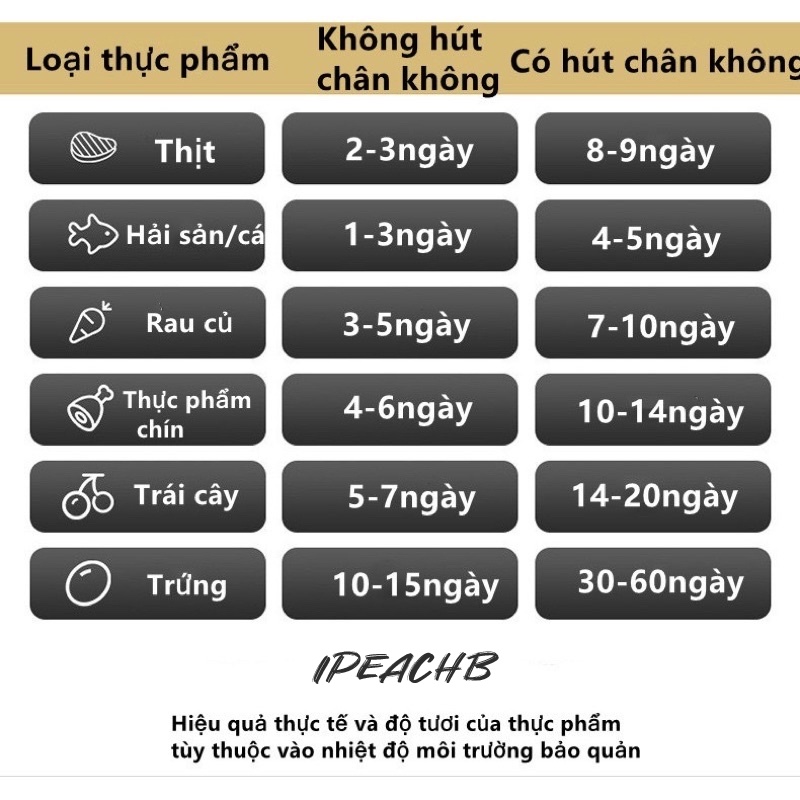 Máy dùng để hút chân không thực phẩm, rút chân không kiệt khí, bảo quản thực phẩm như thịt, cá, rau củ, các loại hạt, đồ ăn sẵn như lạp xưởng, xúc xích, mực khô, măng khô, hoa quả... giúp cho thực phẩm tươi lâu.