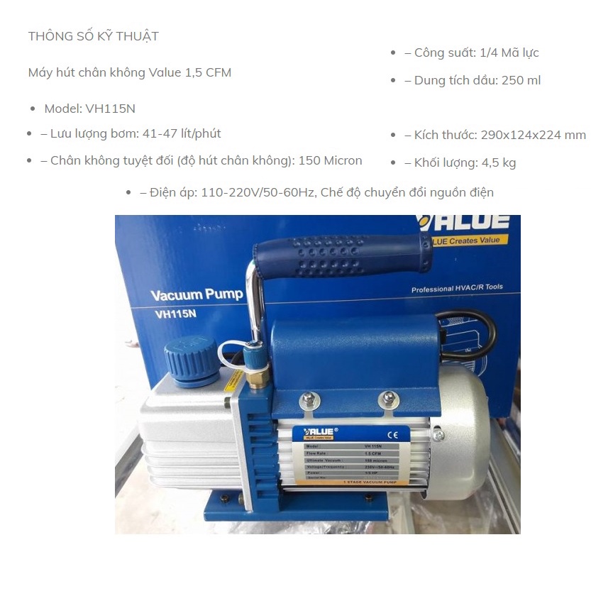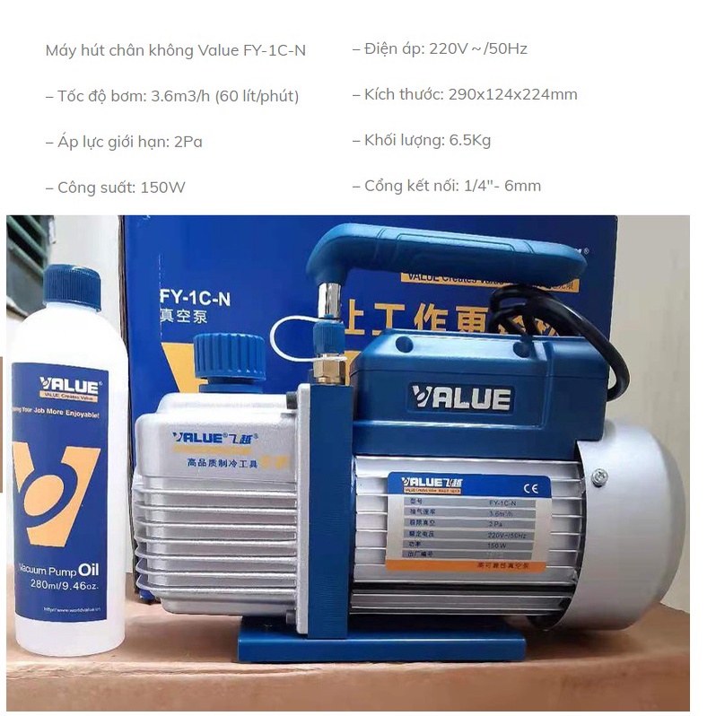 Giới thiệu Máy hút chân không VALUE 1.5 CFM FY-1C-N VH115N chuyên thiết bị dụng cụ điện lạnh bảo dưỡng điều hoà vật tư ngành lạnh