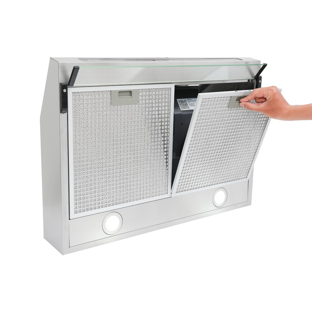 Máy hút mùi được trang bị tấm lưới lọc bằng hợp kim nhôm thông thoáng và chắc chắn, cho bạn dễ dàng tháo lắp khiến việc vệ sinh trở nên nhanh chóng và đơn giản. Bạn ngâm nước nóng cho tan bớt dầu mỡ sau đó đánh rửa bằng các chất tẩy thông thường. Bên cạnh đó còn giúp bảo vệ động cơ máy bên trong, nâng cao tuổi thọ sản phẩm.