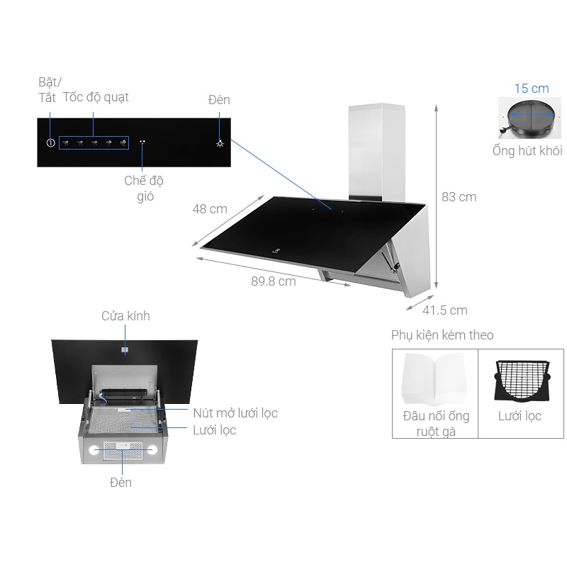 - Máy hút mùi áp tường có công suất hút lớn tới 760 m³/h, 3 tốc độ giúp hút mùi nhanh