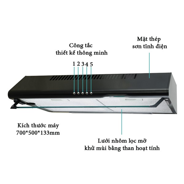 - 2 lưới nhôm lọc mỡ, khử mùi bằng than hoạt tính