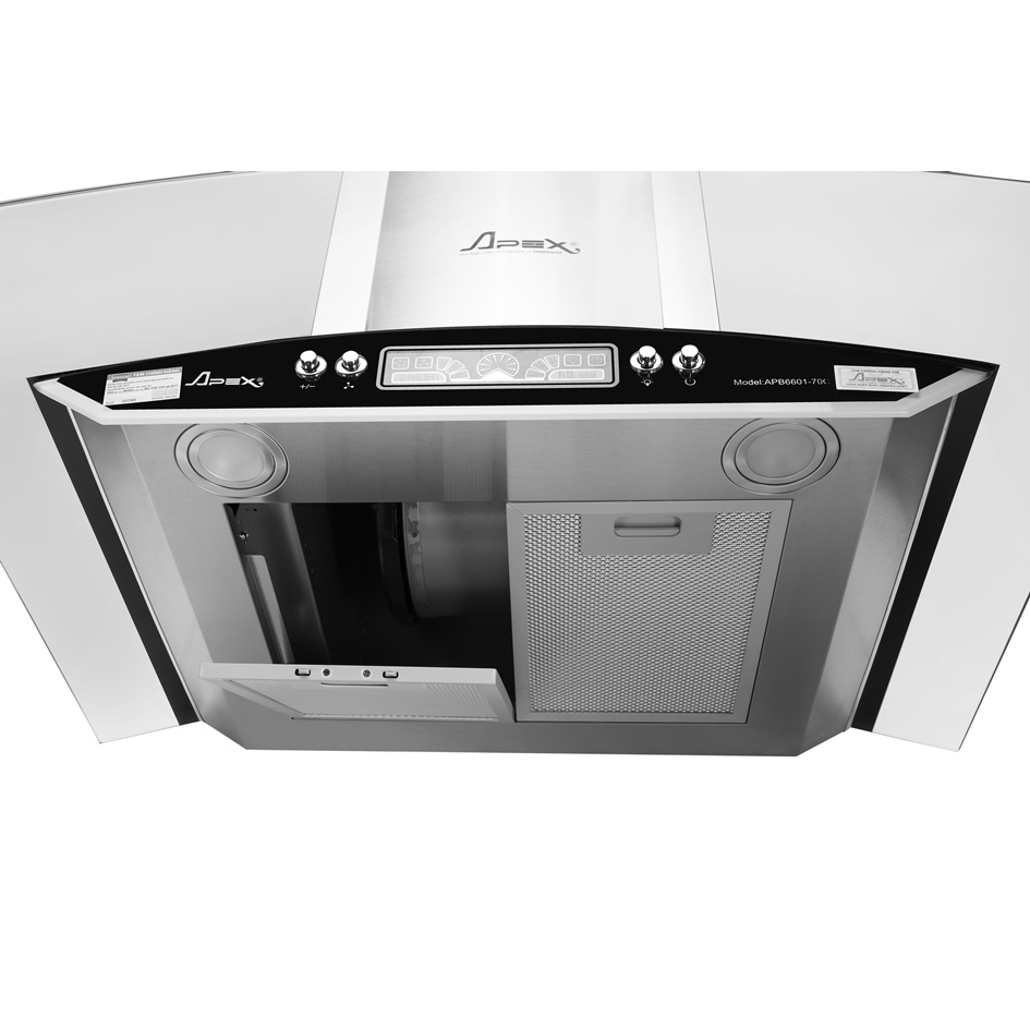 Máy hút mùi kính cong APEX APB6601-70C thiết kế bắt mắt, chất lượng tốt, hút mùi hiệu quả, thích hợp sử dụng trong nhà hàng, gia đình, khách sạn...