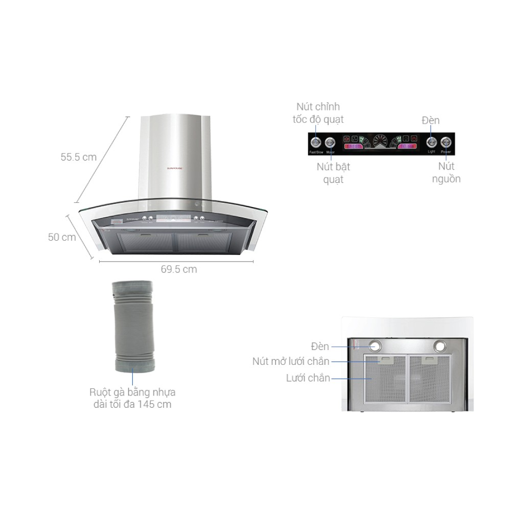 Thông số kỹ thuật: Máy hút mùi kính cong Sunhouse SHB6626Tên sản phẩm/Model: SHB6626