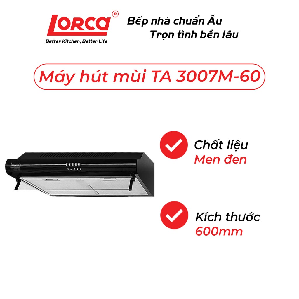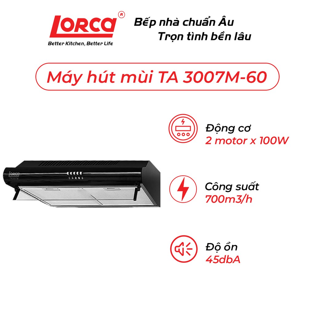 Tên sản phẩm: Máy hút mùi Lorca TA 3007M -60 cm (45 dbA) - Bảo hành 3 năm🔰 Mô tả sản phẩm: