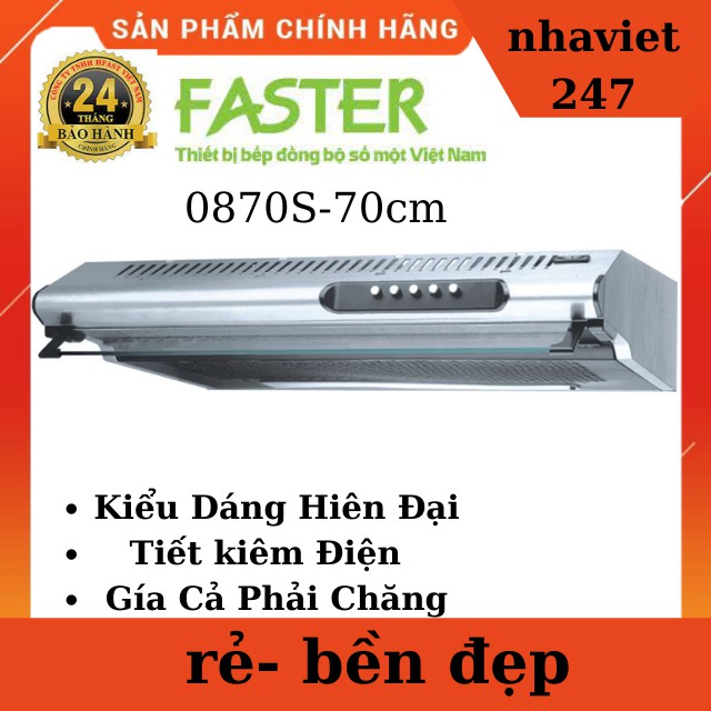 Máy Hút Mùi Faster FS - 0870S có Motor: 02 x 95W, Công suất hút: 650m3/h. Độ ồn: <= 60dB, hút siêu êm Khử sạch mùi chỉ trong tích tắc, tạo không gian thoáng mát cho không gian bếp nhà bạn. Điều khiển: Phím nhấn 3 tộc độ. Điện áp: 220V50Hz, đèn: 2 x 15W. Lưới lọc mỡ: Aluminum - 3 lớp, lọc sạch mỡ thừa.