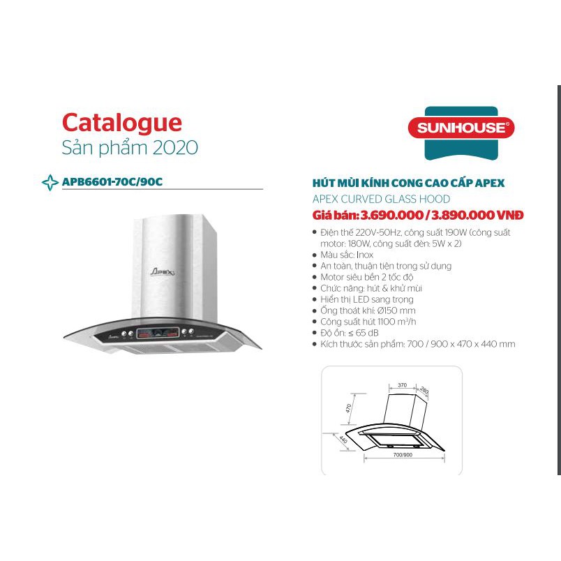 Thiết Bị Điện Gia Dụng > Đồ gia dụng nhà bếp > Máy hút khói || [Mã 44ELSALE1 giảm 5% đơn 3TR] Máy hút mùi Sunhouse APEX APB 6601-70CCòn hàng