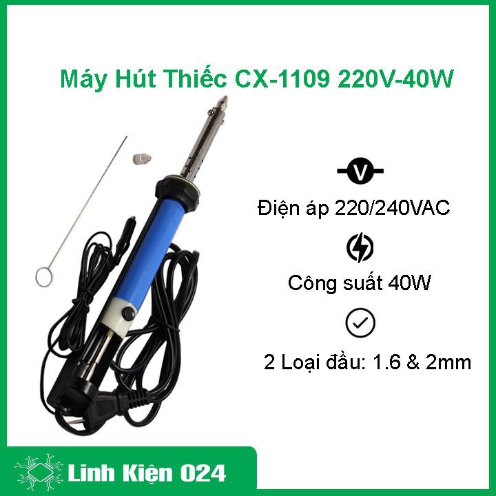 Máy Hút Thiếc CX-1109 220V-40WNgày nay, để đánh giá một sản phẩm, ngoài việc đánh giá chất lượng thì độ thẩm mĩ cũng là yếu tố quan trọng. Và đối với mạch điện tử cũng vậy, trong quá trình gia công, hàn mạch,... sẽ xuất hiện những hiện tượng như thiếc bị dây ra gây mất thẩm mĩ và ảnh hưởng tới chất lượng của sản phẩm. Để cải thiện, khắc phục tình trạng này, Linh Kiện 024 chúng tôi cung cấp máy hút thiếc CX-1109 để hút thiếc, linh kiện lỗi ra khỏi sản phẩm.