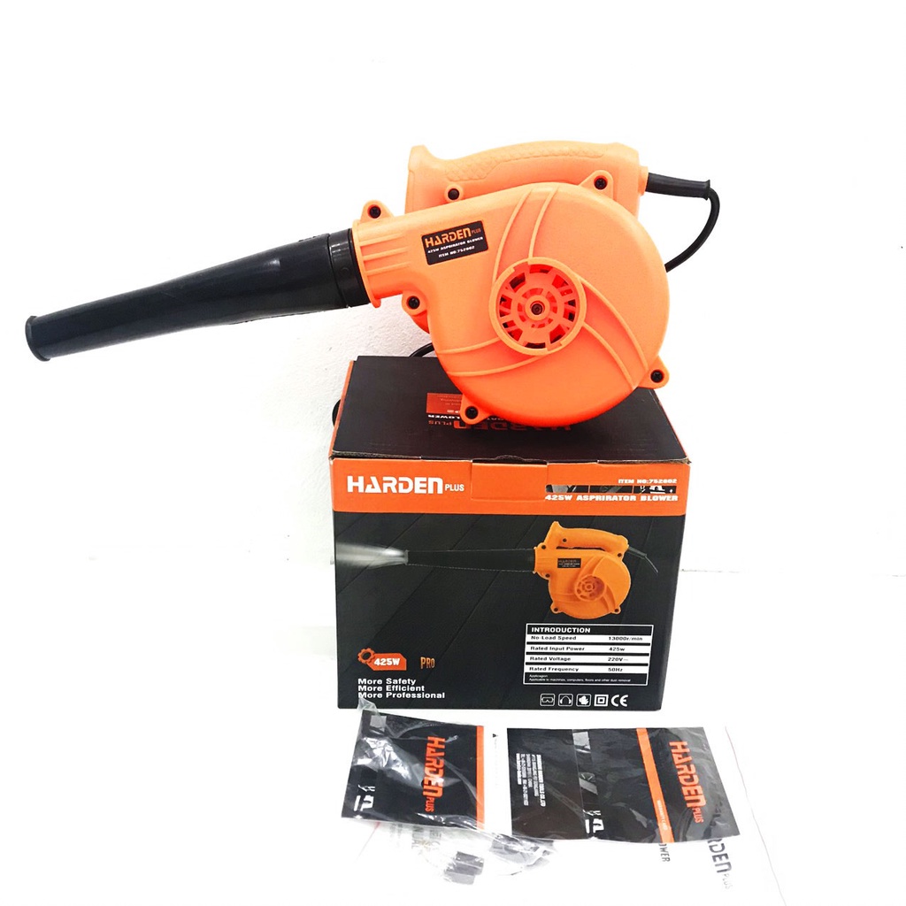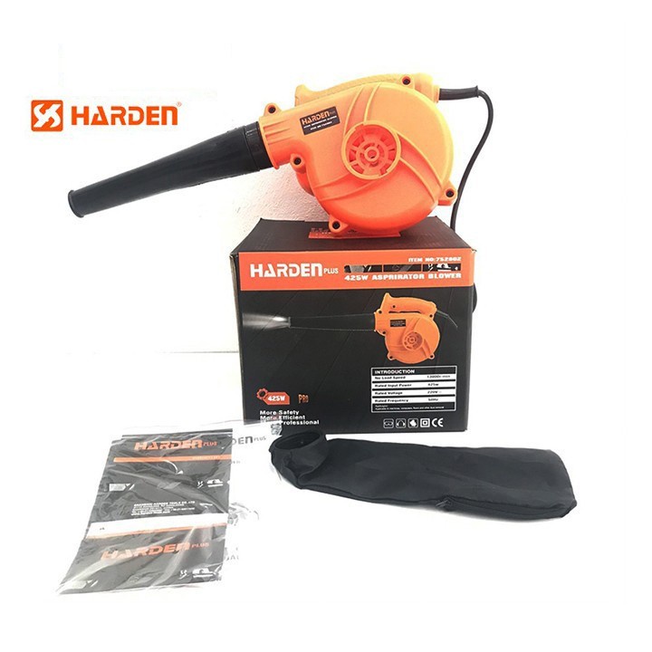 - Máy thổi bụi Harden 752802 sử dụng điện 220V, công suất đầu vào định mức là 425W giúp hút thổi bụi khỏe với lưu lượng khí là 2.3 m3/phút.