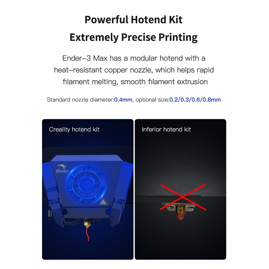 _Bộ công cụ Hotend mạnh mẽ - In cực kỳ chính xác: Máy in 3d Ender-3 Max có bộ công cụ mô-đun với đầu phun bằng đồng chịu nhiệt, giúp làm tan sợi nhanh chóng, đùn sợi mịn.