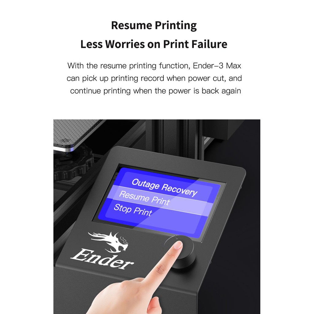 _Tiếp tục in-Giảm thiểu lo lắng về lỗi in: Với chức năng in tiếp tục, Ender-3 Max có thể nhận các bản ghi in khi bị cắt điện và tiếp tục in khi có điện trở lại.