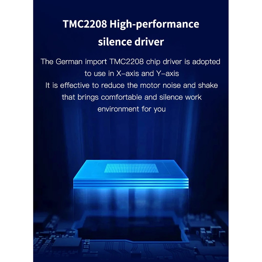 _TMC2208 Trình điều khiển im lặng hiệu suất cao: Trình điều khiển chip TMC2208 nhập khẩu của Đức được sử dụng cho trục X và trục Y. Nó có hiệu quả để giảm tiếng ồn và rung động của động cơ, mang lại một môi trường làm việc thoải mái và yên tĩnh cho bạn