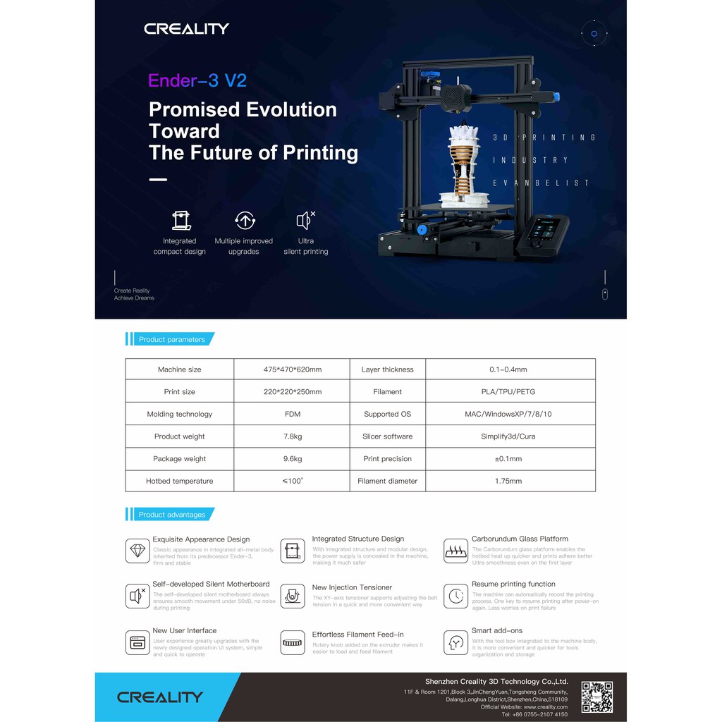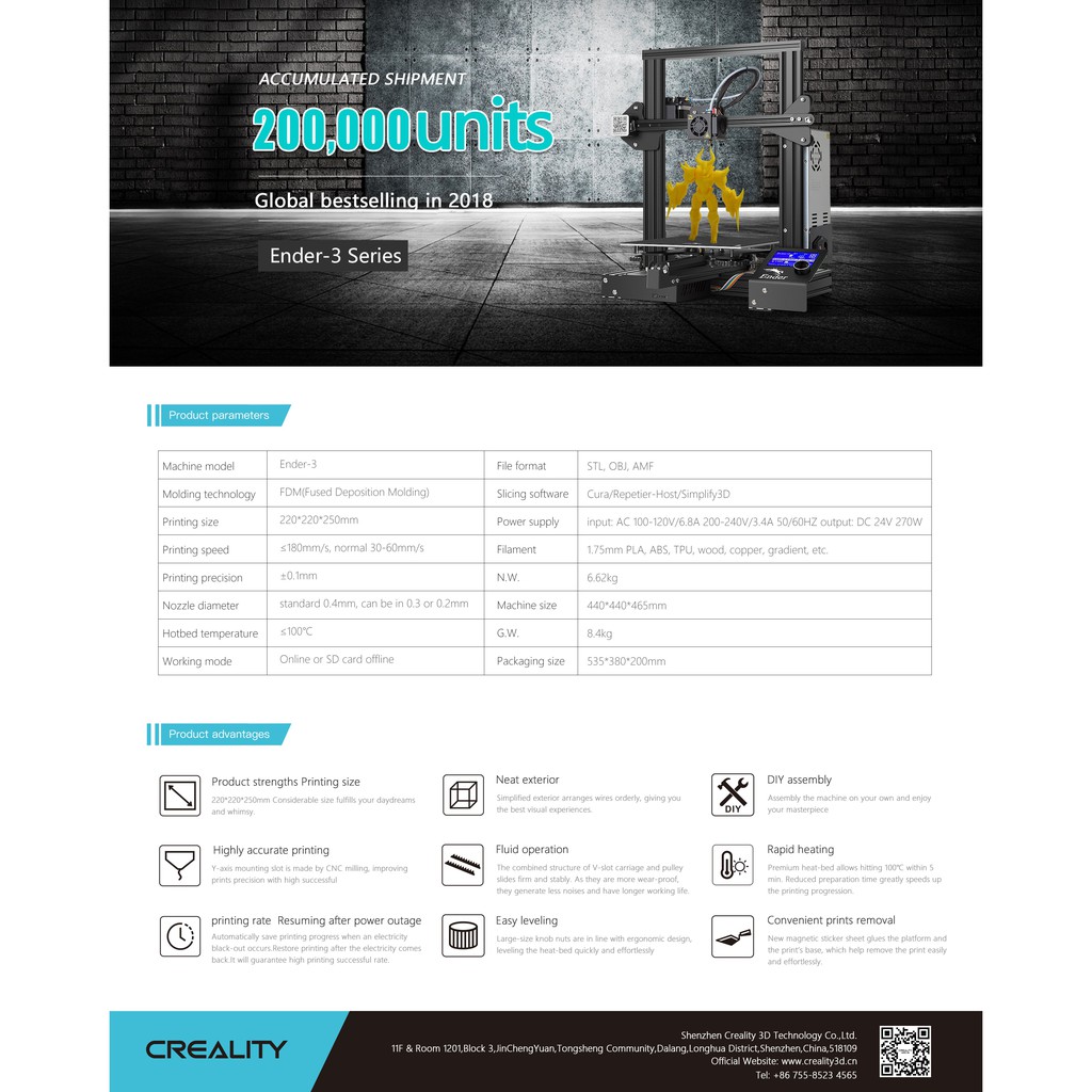 Là một phiên bản cơ bản. khá dễ lắp ráp, mặc dù phải cân bàn bằng tay, núm chỉnh cỡ lớn được cải tiến giúp thuận tiện hơn khi cân bàn Nhiều người dùng đã đề cập rằng Ender-3 vượt xa mong đợi của họ.Nó vẫn có sẵn để in và các loại sợi khác, vì hiệu suất tương đối cao , mang lại độ chính xác cao khi in Có một số tính năng làm cho Creality Ender-3 trở thành máy in 3d phù hợp cho người mới bắt đầu. Bàn nhiệt củaà dạng có khả năng làm nóng đến 110 trong 5 phút Creality nhận ra rằng trục Y đi kèm với Ender-3 có kích thước không lớn .Và đôi khi có bụi ở phần dưới cùng. Máy Ender 3 chỉ sử dụng bộ nguồn thông thường mà không phải Meanwell