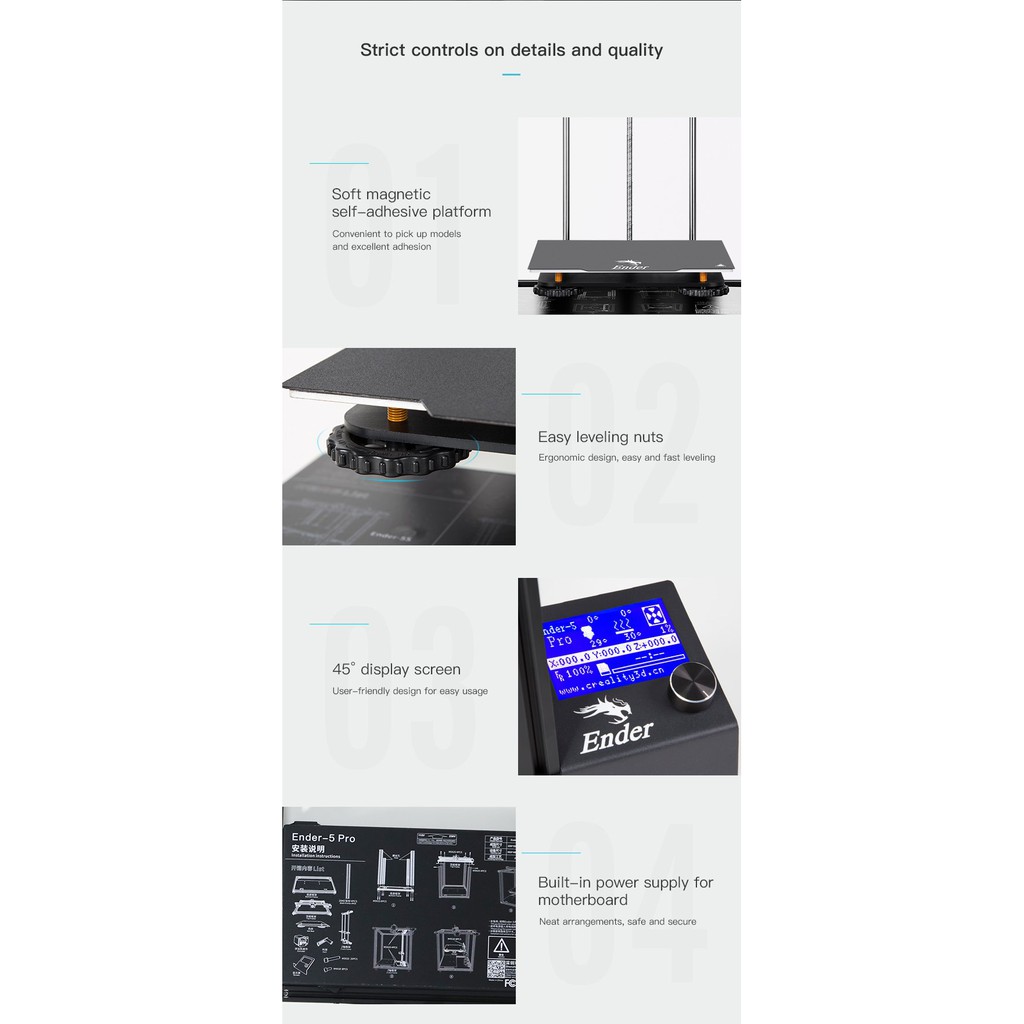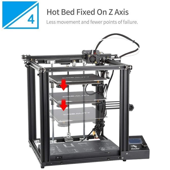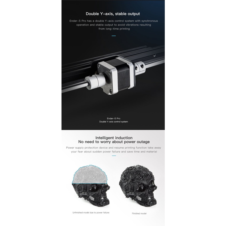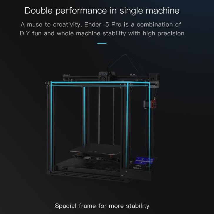 _Ender 5 Pro Printer là dạng máy in 3d cấu trúc khối, được thiết kế theo trục Y kép, bao gồm bo mạch chủ im lặng để tránh tiếng ồn xảy ra, cùng với một nền tảng có thể tháo rời, những tính năng này giúp mở khóa việc in không bị gián đoạn của 100% nguồn cấp dữ liệu sợi từ đầu vào.