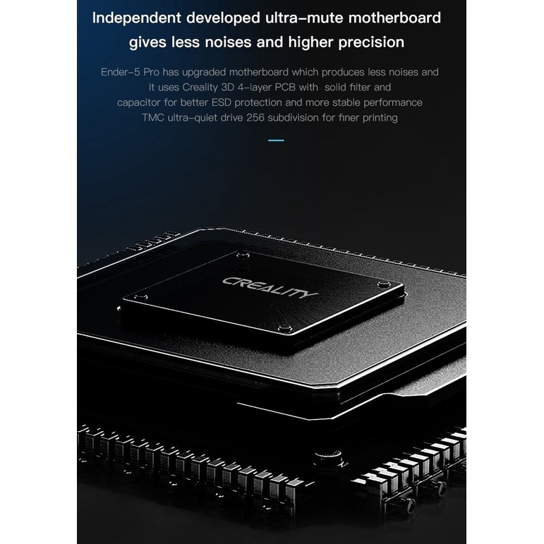_Một thuộc tính duy nhất của Máy in 3D Ender 5 Pro là Mainboard V4.2.2 im lặng mới với trình điều khiển TMC2208, cho phép hiệu suất in êm hơn và chính xác hơn. Mainboard này được cài đặt cả Marlin 1.1.8 và Bootloader, đồng thời cũng được kích hoạt tính năng bảo vệ đường băng nhiệt, cung cấp khả năng bảo vệ bổ sung trong trường hợp máy in đạt nhiệt độ cao bất thường.