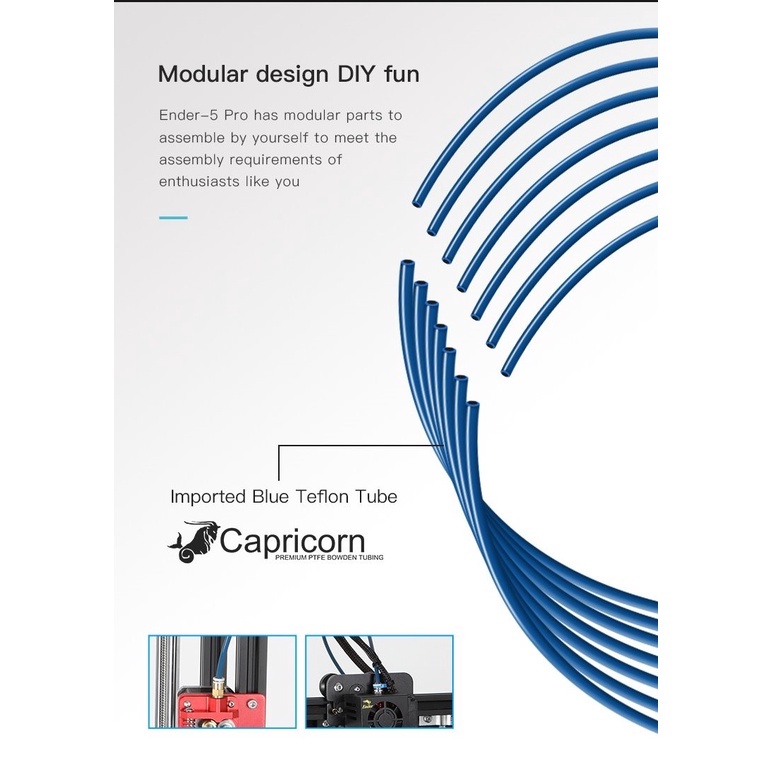 _Cuối cùng nhưng không kém phần quan trọng, Máy in 3D Creality Ender 5 Pro cũng bao gồm ống dẫn sợi nhựa mới và cải tiến. Ống Capricorn Bowden PTFE có đường kính trong 1,9mm ± 0,05mm, giảm bất kỳ khoảng trống dư thừa nào và ngăn không cho dây tóc bị xô lệch bên trong ống. Việc bổ sung ống cao cấp này làm cho Ender 5 Pro phù hợp hơn để in với các sợi nhựa dẻo linh hoạt và các vật liệu đặc biệt khác.