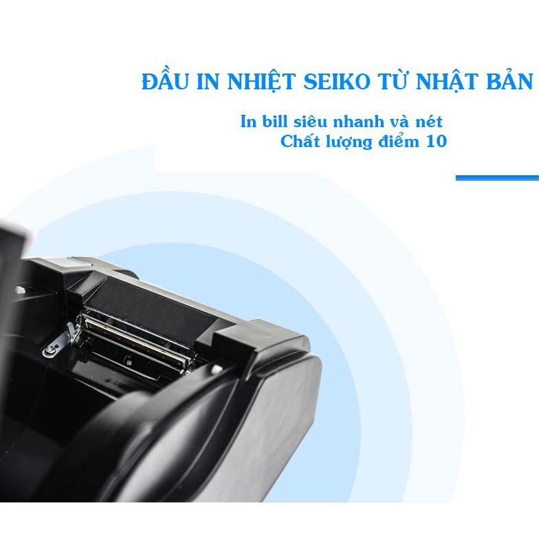 + In nhiệt khổ 57, 58mm, tốc độ in 90mm/s, Đầu in Seiko với độ bền 50km