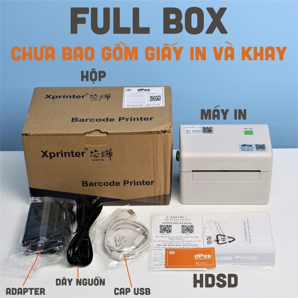 - Bộ sản phầm gồm: Máy in, Nguồn + Adapter, Cable USB & HDSD