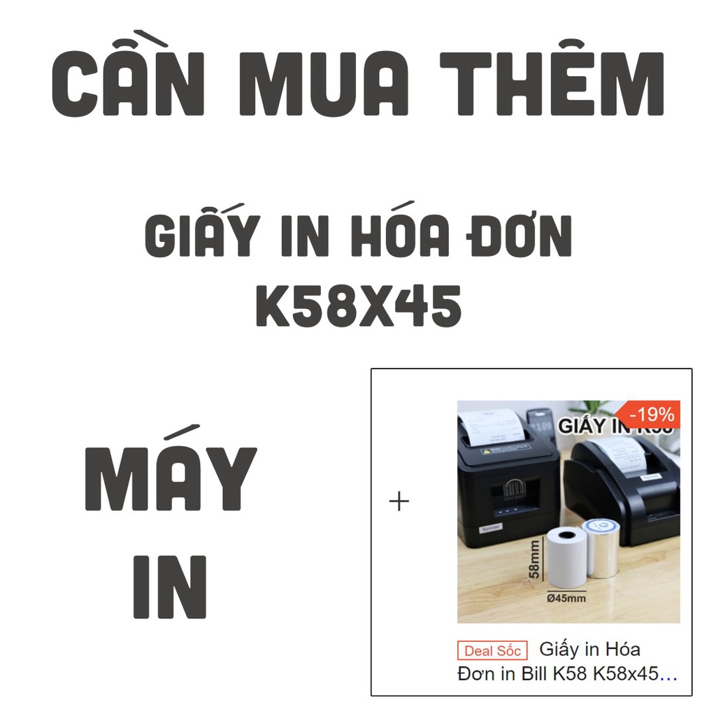 - Loại giấy in bill: giấy nhiệt khổ 57mm hoặc 58mm. Đường kính cuộn 45mm