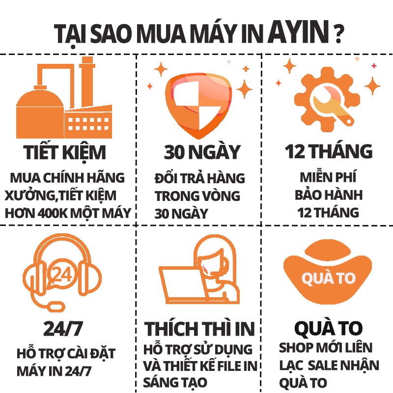 - Bảo hành: 12 tháng. Lỗi 1 đổi 1 trong 30 ngày đầu. Nguồn và đầu in bảo hành 6 tháng