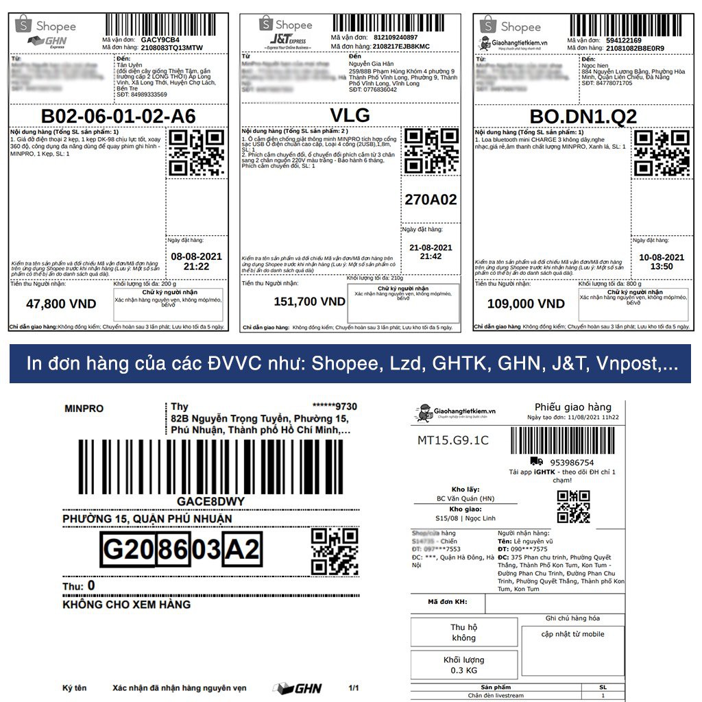 - In được theo toàn bộ sàn TMĐT: Shopee, và các bên GHTK, GHN, Viettel Post, J&T, KiotViet, Sapo, Nhanh,...
