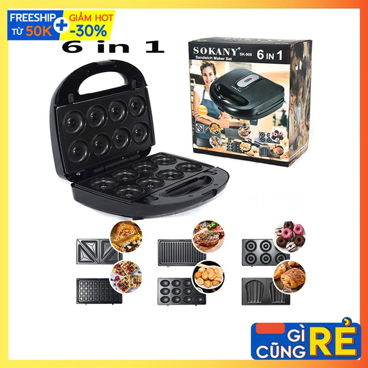 - Kẹp nướng bánh Sokany với thiết kế nướng 6 trong 1, với 6 bộ vỉ nướng đi kèm bạn có thể làm các loại bánh khác nhau như bánh sandwich, bánh waffle, bánh quy, bánh trứng,... hay nướng thức ăn trực tiếp ngay trên vỉ.