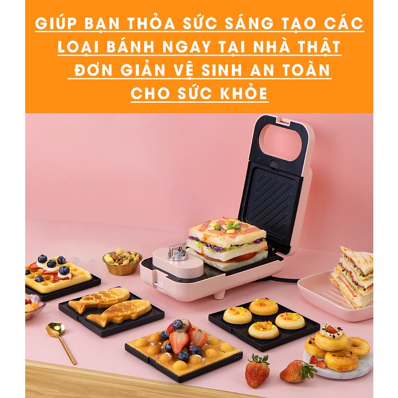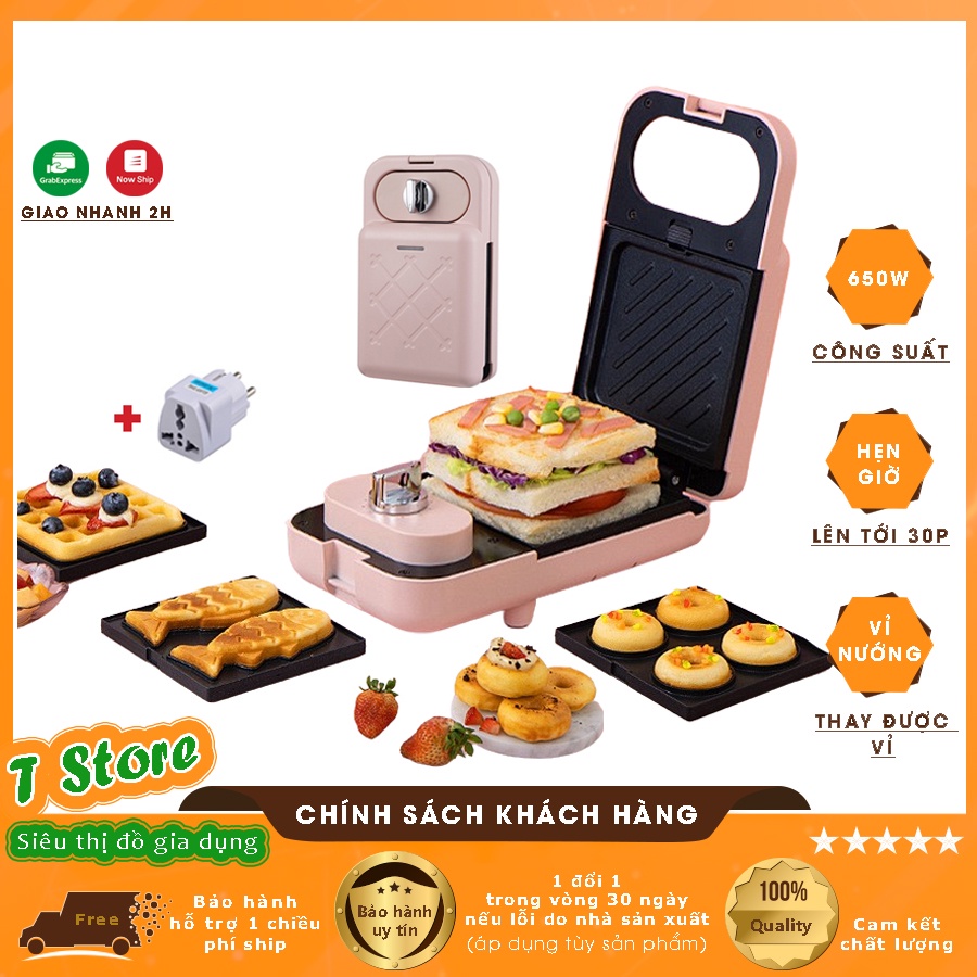 Máy Kẹp Nướng Bánh Mì Sandwich,Waffle Ăn Sáng Cao Cấp Đa Năng Tiện Lợi 650W Kèm 2 Đôi Khuôn Sẵn (Tặng ổ 3 chân sang 2)