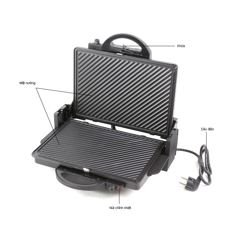 SẢN PHẨM MÁY ÉP - NƯỚNG BÁNH MỲ TIROSS TS - 965Máy không chỉ giúp bạn chế biến món nướng, xiên que mà còn có chức năng làm bánh mì sandwich. Máy có hai mặt nướng nên có thể nướng được nhiều thức ăn hơn; mỗi mặt đều có nút điều chỉnh nhiệt độ riêng. Thiết kế mặt nướng có rãnh giúp thức ăn không dính và giảm thiểu dầu mỡ. Khi không sử dụng, hai mặt của Kẹp nướng điện Tiross TS965 có thể gập lại và khóa chốt, nhằm giúp bạn tiết kiệm diện tích và dễ dàng bảo quản.
