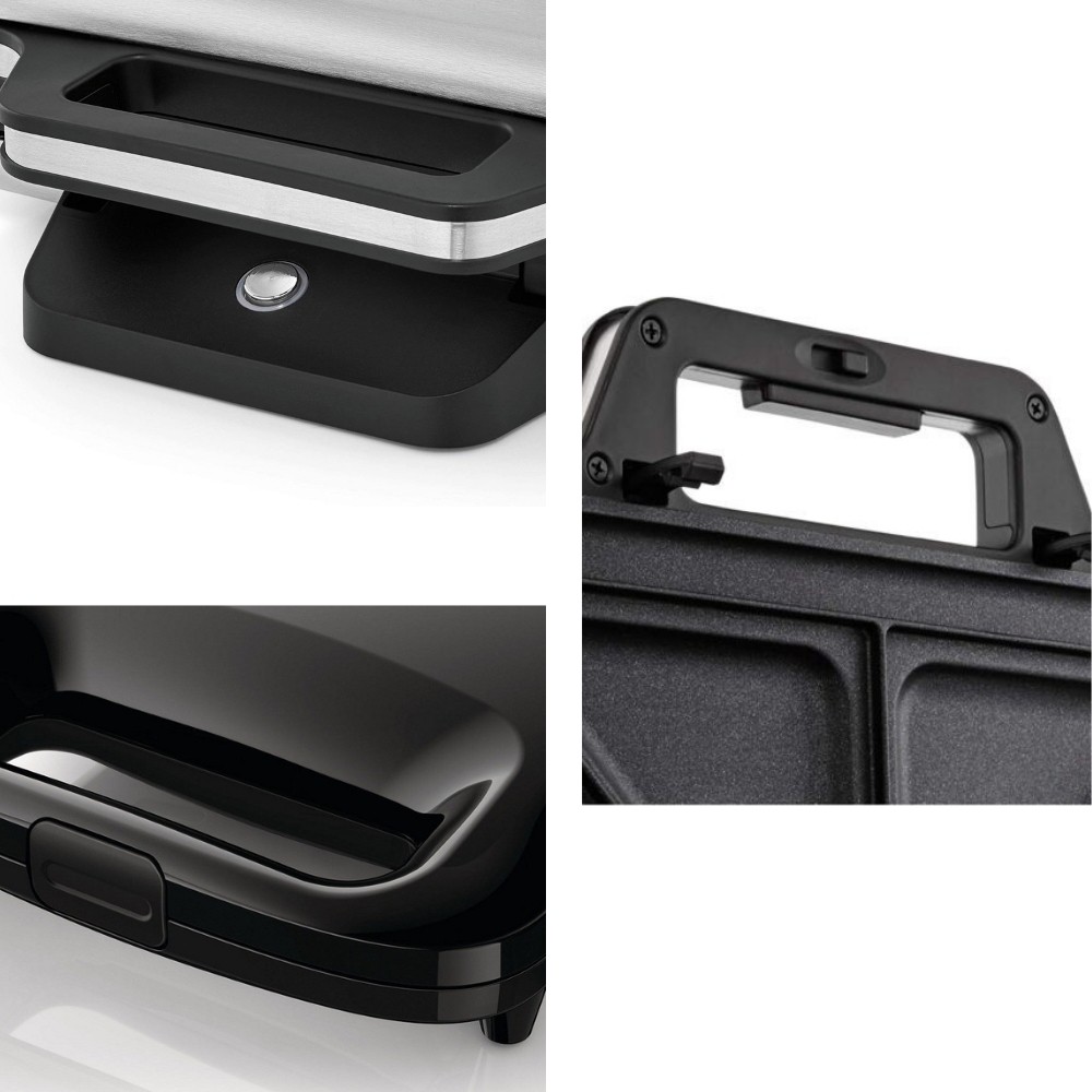 - Khóa tay cầm biến đổi với hai cấp độ điều chỉnh chiều cao thích ứng với độ dày của từng miếng bánh sandwich, đảm báo bánh sẽ được nướng đều và không bị cháy.