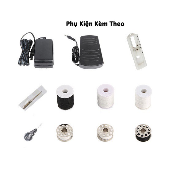 -Phụ kiện đi kèm gồm: adapter, pedal. 3 cuộn chỉ. 3 chiếc suốt, 2 kim.