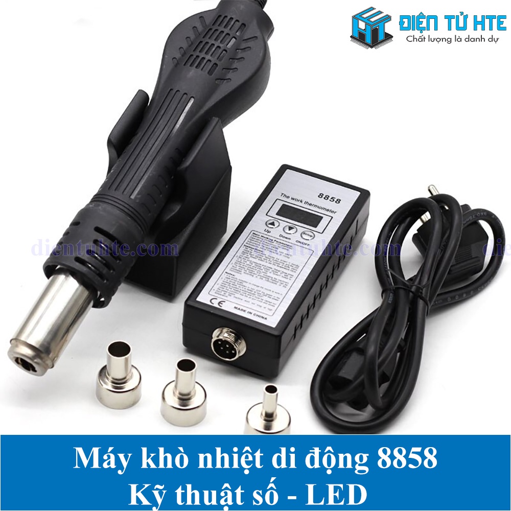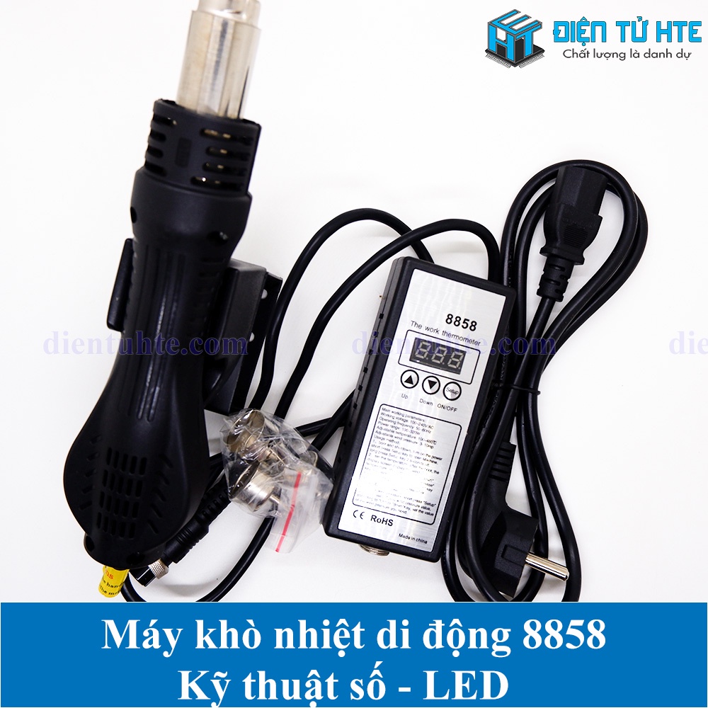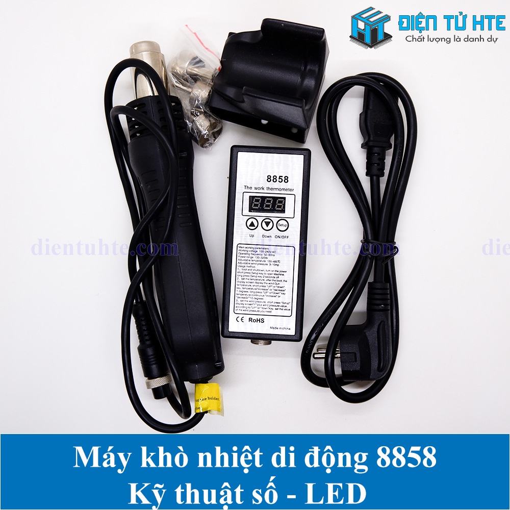 Máy khò nhiệt di động 8858 650W hiển thị LED - 220VACMáy có thiết kế di động, gọn hàng dễ mang đi, sử dụng trực tiếp điện áp 220V với công suất 650W giúp người dùng thao tác tốt với hầu hết các linh kiện trên mạch điện tử/
