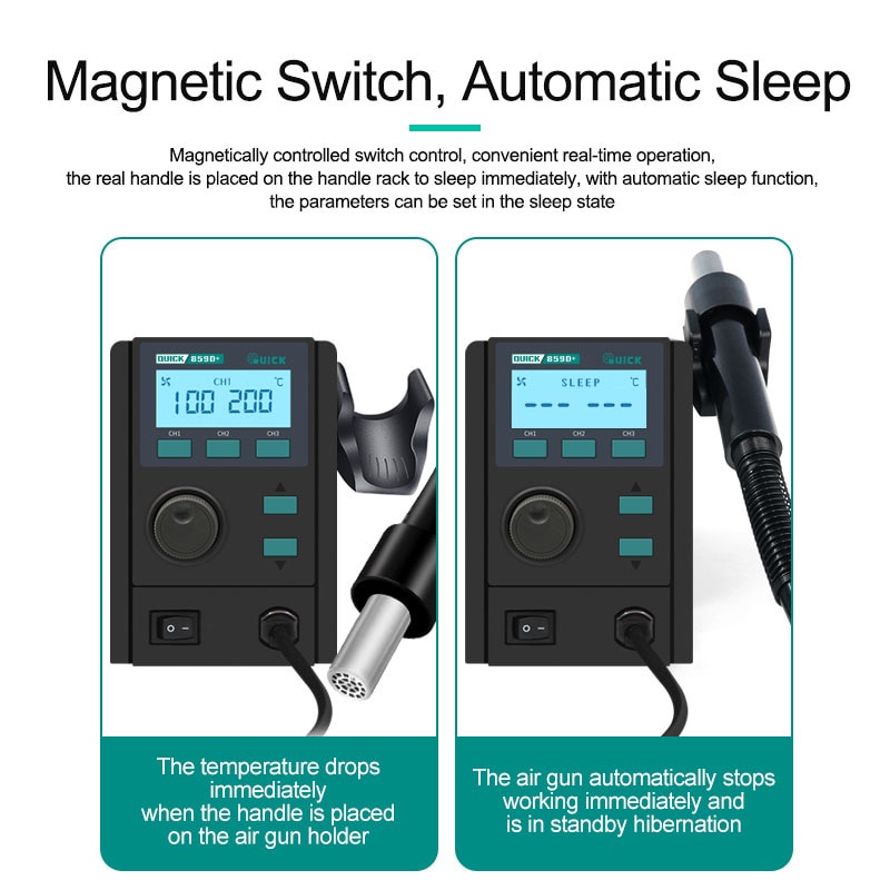 Máy khò Quick 859D+ là sản phẩm mới ra mắt đầu năm 2022 như một bản nâng cấp sịn sò của dòng 857DW+Các bạn đã quen với dòng máy 857 thì đây là 1 bản nâng cấp mạnh mẽ với 3 kênh nhớ, tính năng căn chỉnh nhiệt, tính năng COOL (thổi mát), tính năng đặt mật khẩu cho máy và một diện mạo mới là 5 điểm mà 857 không hề có.