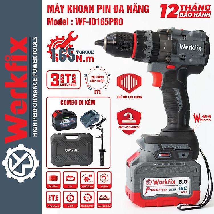 Giới thiệu Máy Khoan 3 Chức Năng 165N.m Workfix - WF-ID165PRO - Đầu Kẹp 13mm Auto Lock - Anti Kickback - Có Tạo Xung Vô Cấp - Tính Năng Eco-Tubo - Brushless Motor - Chân Pin Phổ Thông - 2 Pin 15 Cell - Có Tay Cầm Trợ Lực