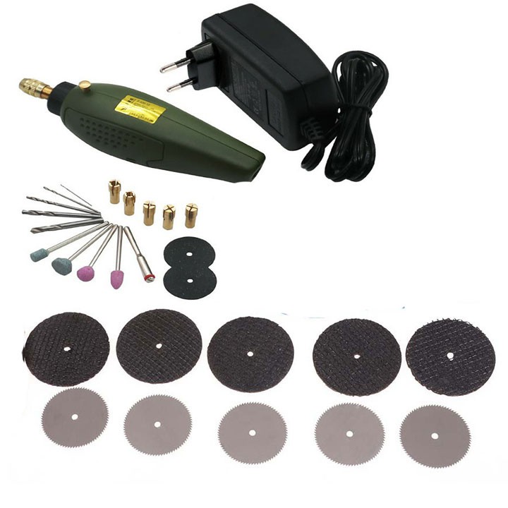 1 Hộp đựng, 1 Máy khoan, 1 Nguồn 12V, 5 Mũi khoan các cỡ, 5 Đầu giữ mũi khoan, 4 Đầu mài, 1 Đầu dùng để gắn đĩa cắt, lưỡi cưa, chổi quét...,
