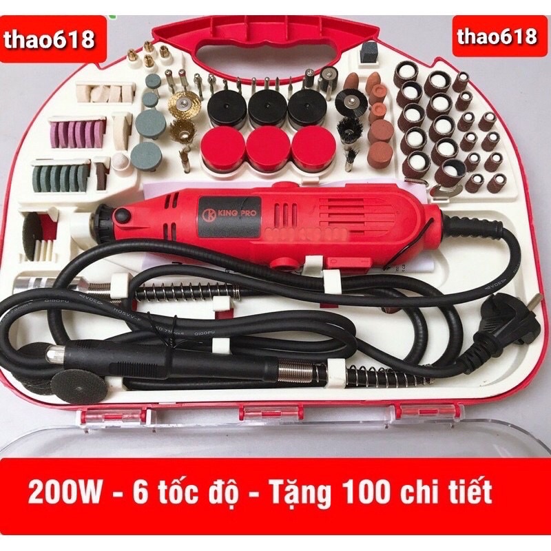 Bộ Máy Khoan Mài cắt Khắc mini Đa Năng Kingpro 200W 100 chi tiết (Đỏ) Điều Chỉnh 6 tốc độ - Tặng kèm bộ lưỡi cưa vỉ