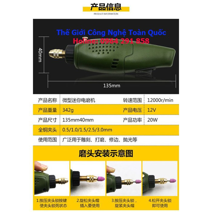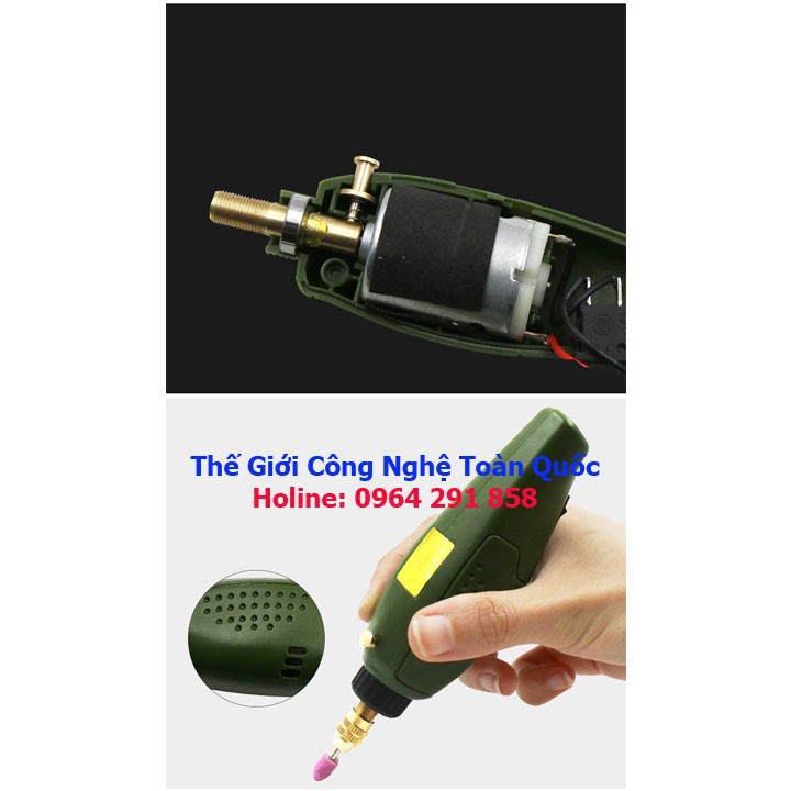 dùng được các loại mũi khoan từ 0.5, 1.0, 1.5, 2.5, 3.0 mm, rất thích hợp để khoan, cắt, và mài
