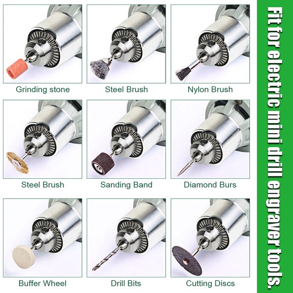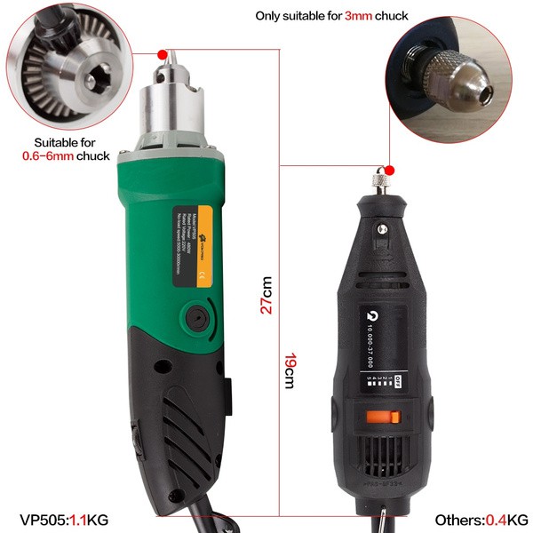 - Máy có thể lắp các loại mũi khoan, các đĩa cắt hợp kim để cắt kim loại, các loại lưỡi cưa để cưa gỗ, cưa mica…các loại mũi đá mài hoặc mũi điêu khắc để tạo hoa văn trên kim loại, trên thủy tinh, đá hoặc gốm sứ v.v… Bạn có thể dùng để chạm khắc, chế loa, xử lý bảng mạch, gia công thủy tinh,…