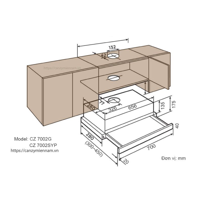 + Phần động cơ máy (chiều cao 135mm) sẽ được che bởi cánh tủ. Chỉ để phần lưới lọc mỡ kéo ra (chiều cao 40mm) hở để có thể kéo ra (mở máy) đẩy vào khi không sử dụng.