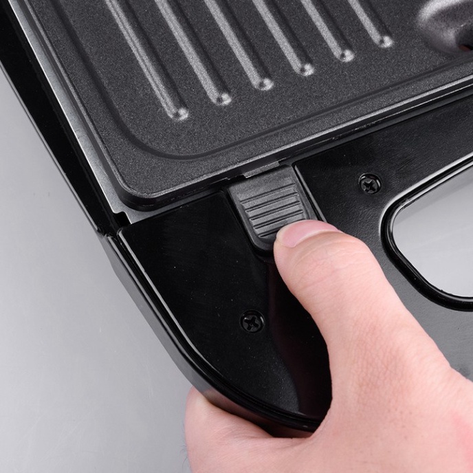 - Khóa kẹp lại bằng núm khóa trong khi máy đang nướng. Tùy theo sở thích bạn có thể nướng 2 - 3 phút. Khi mở kẹp để lấy bánh nên dùng kẹp bằng gỗ hoặc bằng nhựa để lấy bánh ra.