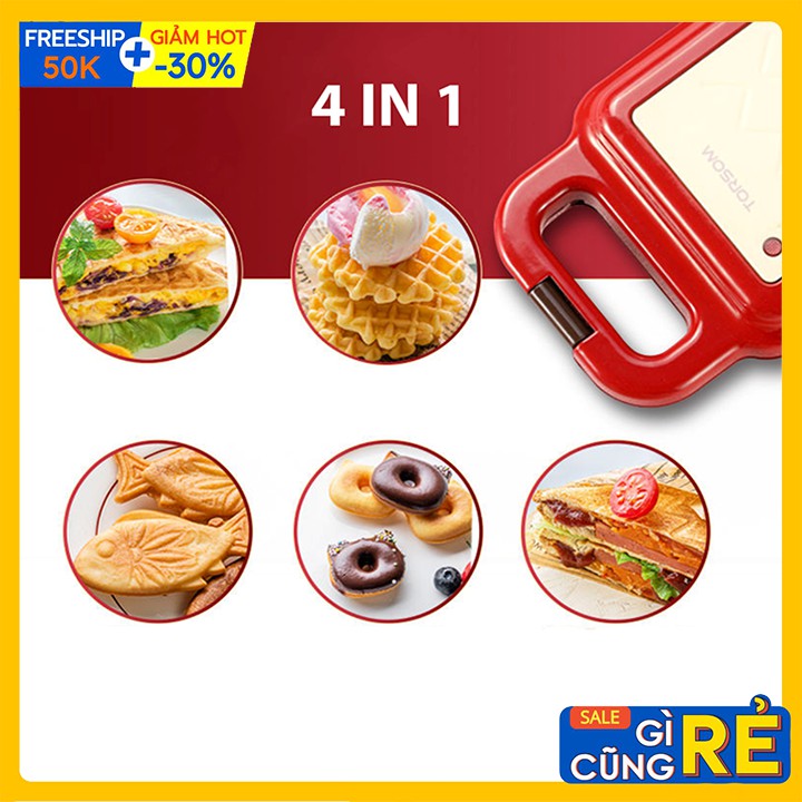 Thiết Bị Điện Gia Dụng > Đồ gia dụng nhà bếp > Máy nướng bánh || Máy làm bánh đa năng 4 khuôn nướng kẹp bánh mì Sandwich, bánh cá, waffle, Donut chính hãng TORSOMCòn hàng