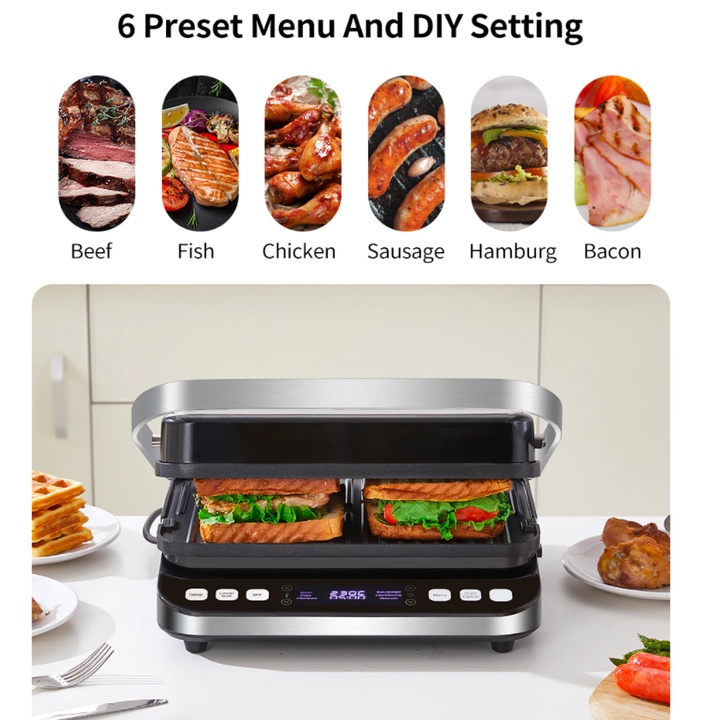 - Bếp nướng điện trong nhà này có 6 chương trình nấu tự động cho Thịt bò, Cá, Gà, Xúc xích, Hamburg và Thịt xông khói. Chỉ một thao tác bấm nút chọn menu, bạn có thể thoải mái thưởng thức những món ăn ngon tại nhà.