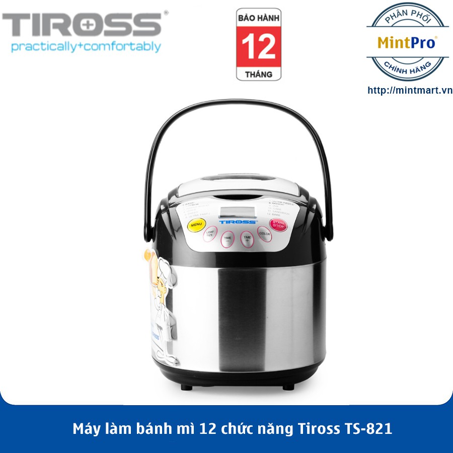 ***Ưu ĐiểmMáy Làm Bánh Mì Tiross 12 Chức Năng TS821 gồm 12 chức năng làm bánh, 3 mức điều chỉnh màu bánh, chức năng hẹn giờ lên đến 13 tiếng và giữ ấm 60 phút sau khi bánh chín. Thân máy bằng inox siêu bền và mang lại vẻ sang trọng. Với máy làm bánh mì Tiross TS821 bạn sẽ nhanh chóng có những chiếc bánh mì nóng nổi để ăn kèm với mứt, thịt nguội, trứng chiên, xà lách... Như vậy không mất quá nhiều thời gian, bạn đã chuẩn bị xong bữa sáng ngon miệng và dinh dưỡng cho gia đình mình.