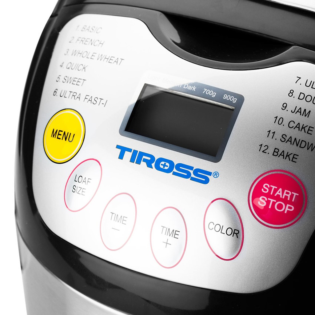 - Tiross TS821 có 12 chức năng làm bánh khác nhau: bánh mì cổ điển, bánh mì Pháp, bánh ngọt, làm bánh nhanh, làm bột, mứt, sandwich... đáp ứng sở thích đa dạng của người dùng. Máy có khả năng làm bánh có khối lượng từ 700 – 900g.