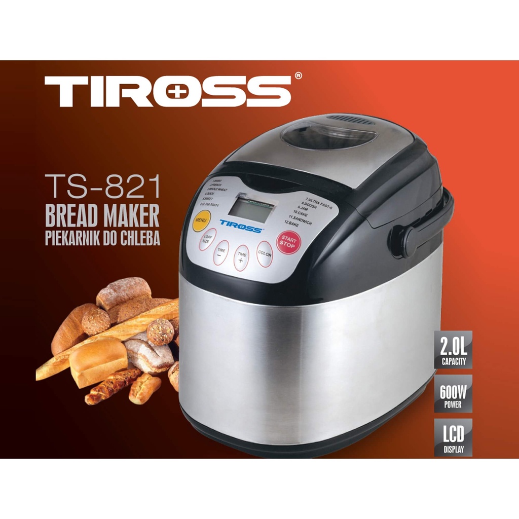 - Tiross TS821 có 12 chức năng làm bánh khác nhau: bánh mì cổ điển, bánh mì Pháp, bánh ngọt, làm bánh nhanh, làm bột, mứt, sandwich... đáp ứng sở thích đa dạng của người dùng. Máy có khả năng làm bánh có khối lượng từ 700 – 900g.