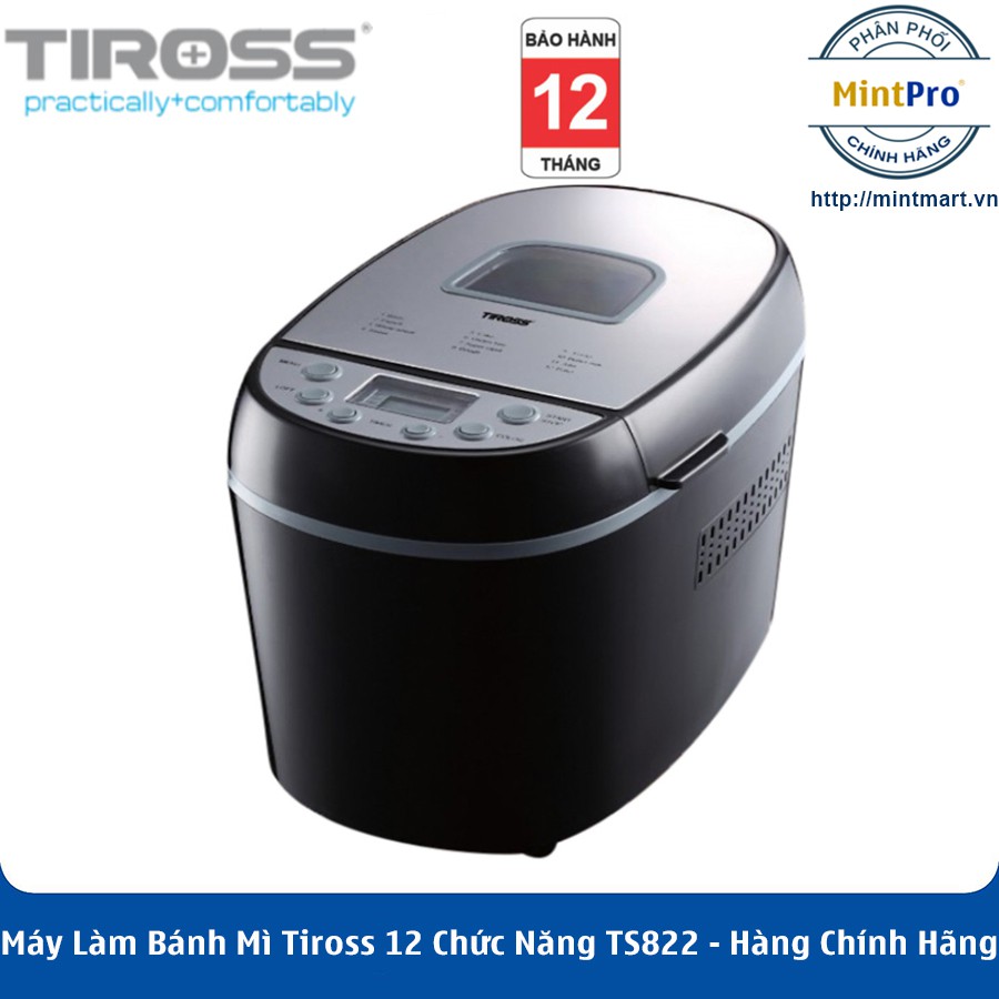 - Công suất 750W và dung tích 3.0L lớn hơn các dòng máy trước đây, Tiross TS-822 có khả năng làm ra khối lượng bánh từ 700 - 1000g với thời gian tối thiểu 3 tiếng