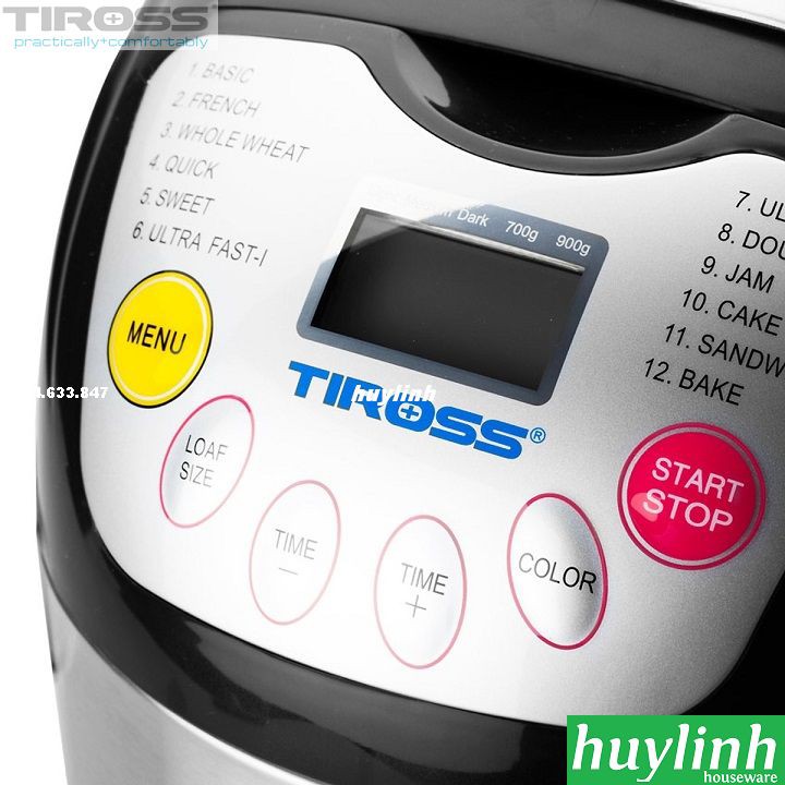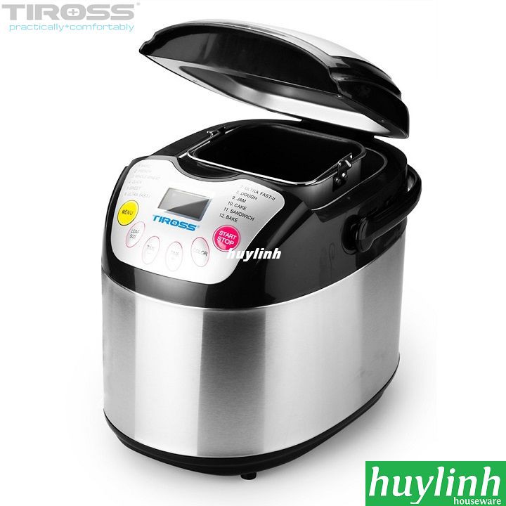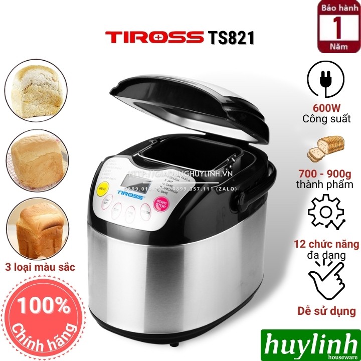 - Tiross TS821 có 12 chức năng làm bánh khác nhau: bánh mì cổ điển, bánh mì Pháp, bánh ngọt, làm bánh nhanh, làm bột, mứt, sandwich... đáp ứng sở thích đa dạng của người dùng. Máy có khả năng làm bánh có khối lượng từ 700 – 900g.