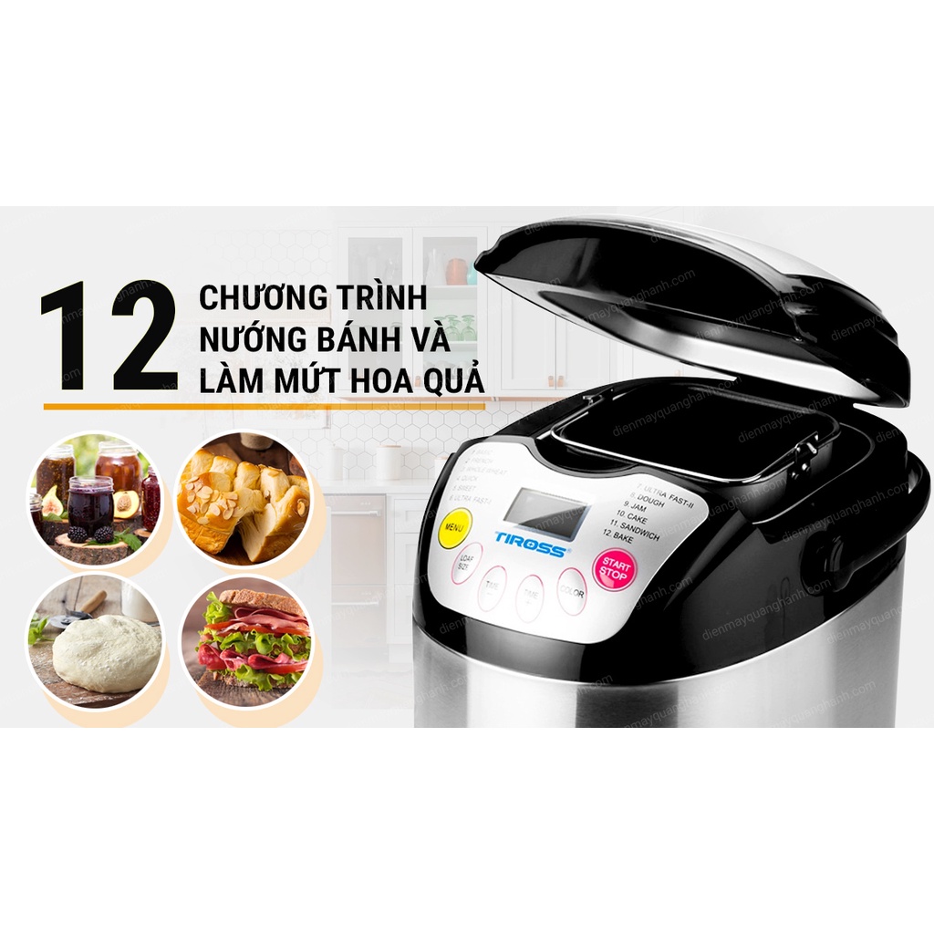 -Máy làm bánh mì Tiross được cài đặt sẵn 12 chức năng làm bánh, 3 mức điều chỉnh màu bánh, chức năng hẹn giờ làm bánh lên đến 13 tiếng và giữ ấm 60 phút sau khi bánh chín. Bạn sẽ dễ dàng lựa chọn các chức năng trên thông qua màn hình LCD và các nút bấm.