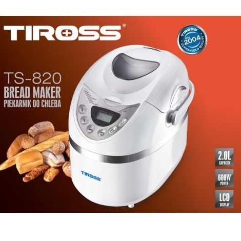- Tiross TS820 có 12 chức năng làm bánh khác nhau: bánh mì cổ điển, bánh mì Pháp, bánh ngọt, làm bánh nhanh, làm bột, mứt, sandwich... đáp ứng sở thích đa dạng của người dùng. Máy có khả năng làm bánh có khối lượng từ 700 – 900g.